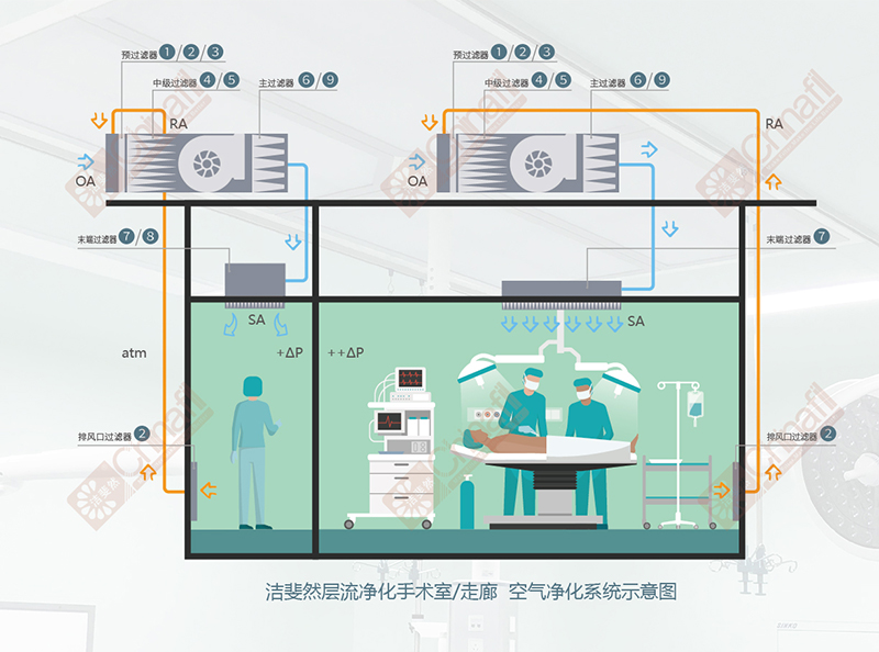 • OBCHINAFIL“洁净医疗系统净化解决方案”在手术室净化中主要采用垂直层流式净化通风模式(Supply air ceiling for operating theatre),在空调/通风系统前端设置有多级空气预过滤(如图❶❷❸❹❺❻❾),并将无隔板高效过滤器设置在手术台正上方(❼),过滤后的洁净空气通过均流膜以均匀的流速向预设的方向输送,且保持微正压,持续确保手术台达到相应的洁净要求,排风系统的回风口通常设在墙面的四角。此外,在通往手术室的走廊也设置有相应级别的空气过滤器(❼❽),以保证手术室的洁净。