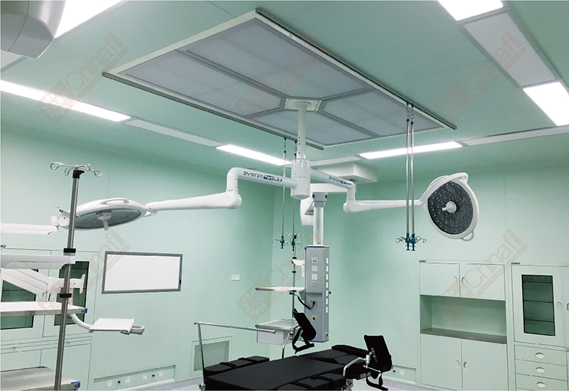 OBCHINAFIL“洁净医疗系统净化解决方案”在手术室净化中主要采用垂直层流式净化通风模式(Supply air ceiling for operating theatre),在空调/通风系统前端设置有多级空气预过滤(如图❶❷❸❹❺❻❾),并将无隔板高效过滤器设置在手术台正上方(❼),过滤后的洁净空气通过均流膜以均匀的流速向预设的方向输送,且保持微正压,持续确保手术台达到相应的洁净要求,排风系统的回风口通常设在墙面的四角。此外,在通往手术室的走廊也设置有相应级别的空气过滤器(❼❽),以保证手术室的洁净。